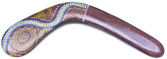 Solid wooden boomerang with brown Aboriginal motifs. The 40 cm long classic is handmade and ideal as a cultural object or for traditional throwing use.