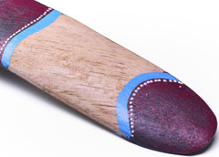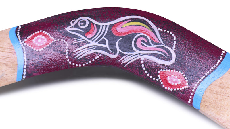 Playful boomerang of 40 cm with frog design in Aboriginal style. Made of wood, hand-painted, and a real eye-catcher for children and enthusiasts of nature and culture.