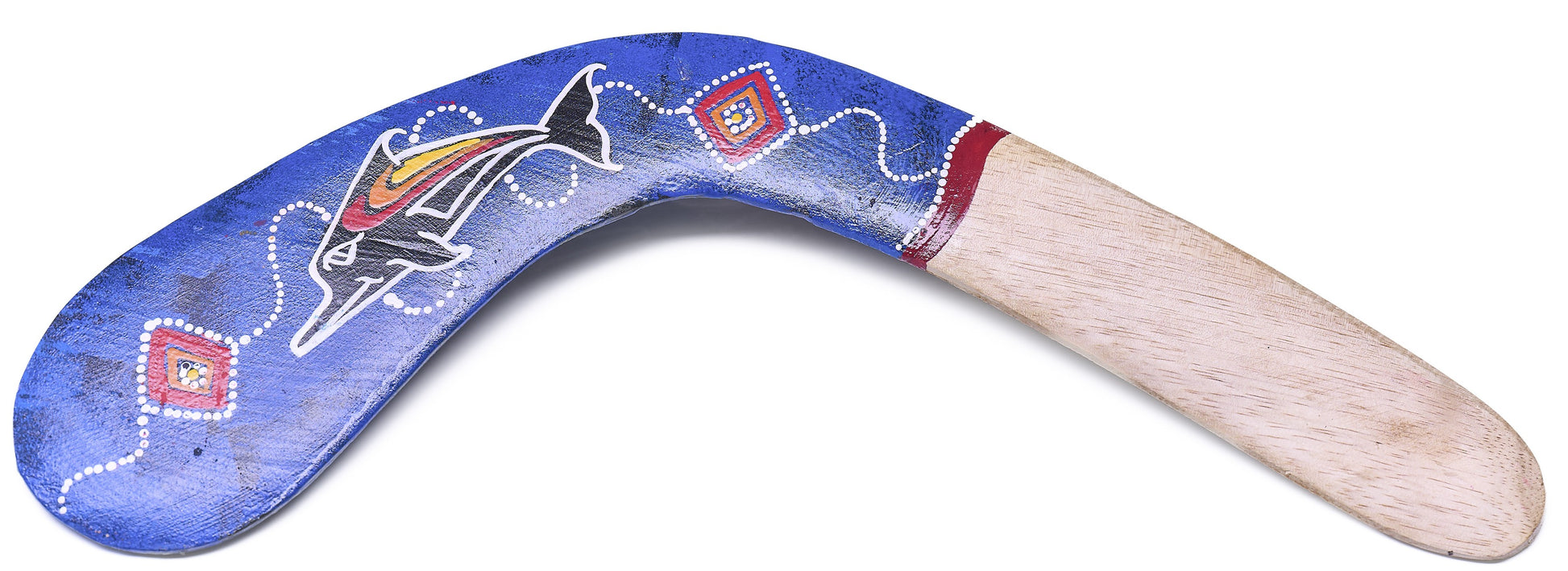 Authentieke houten boemerang (40 cm) met diepblauwe Aboriginal kunst. Cultureel geladen en geschikt voor decoratie, verzamelingen of traditionele demonstraties.