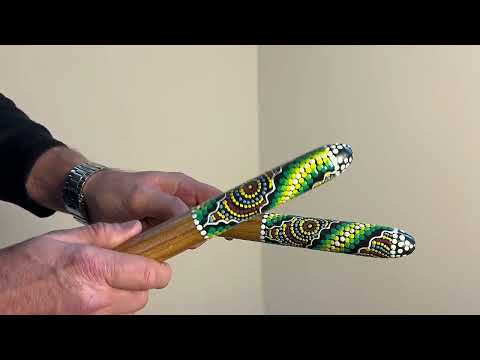 De Dreamtime clapsticks zijn rijk versierd met handgeschilderde motieven die verwijzen naar de Aboriginal "Dreamtime". Perfect voor wie muziek, cultuur en spiritualiteit wil verbinden. Licht, krachtig en een mooie aanvulling op didgeridoo sessies, sjamanistische rituelen of wereldmuziek. Afmetingen 25 x 3 cm