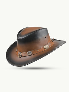De Scippis Tombstone is een stoere cowboyhoed met stonewashed leer en antieke concho’s op de band.